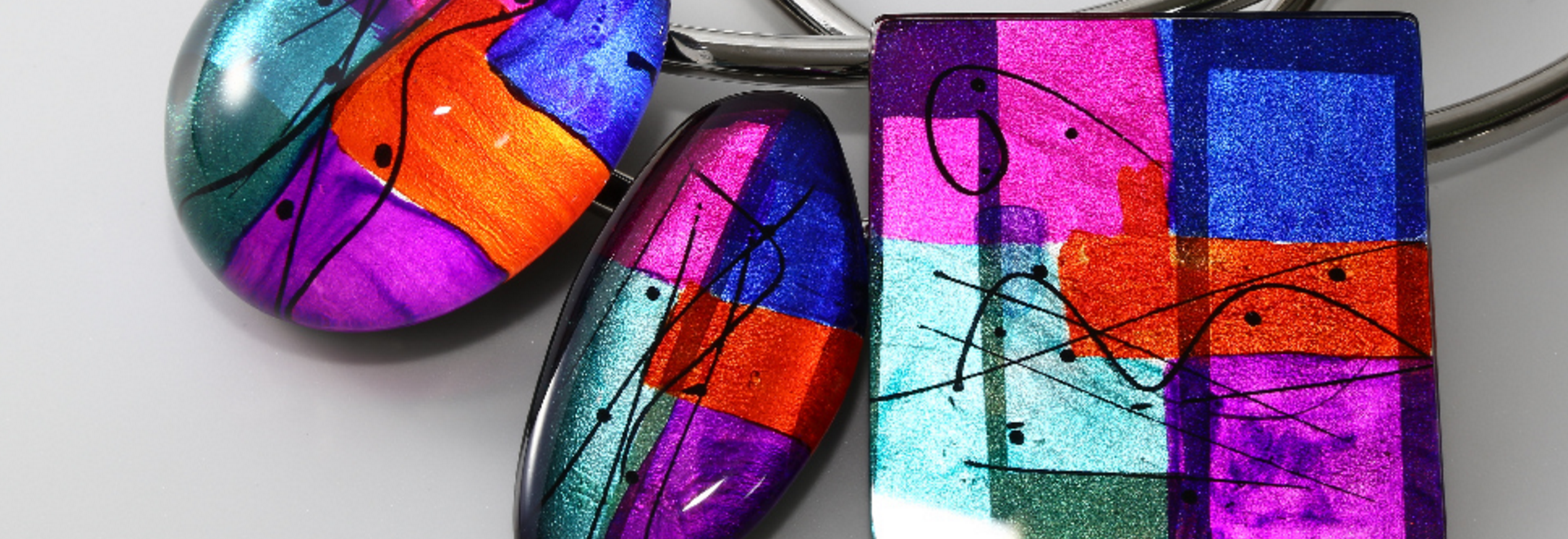 Gail creates hand-painted acrylic jewellery which refracts dense colour with metallic gold and silver undertones across smooth and sculpted surfaces.These interact with the organic curvature and geometry of the highly polished optical-quality acrylic shapes, creating shimmering, ever changing iridescence.