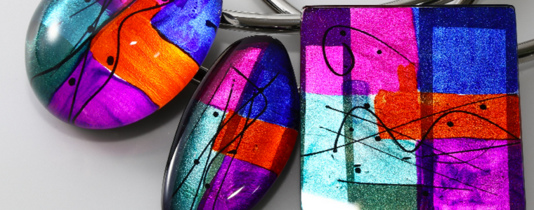 Gail creates hand-painted acrylic jewellery which refracts dense colour with metallic gold and silver undertones across smooth and sculpted surfaces.These interact with the organic curvature and geometry of the highly polished optical-quality acrylic shapes, creating shimmering, ever changing iridescence.
